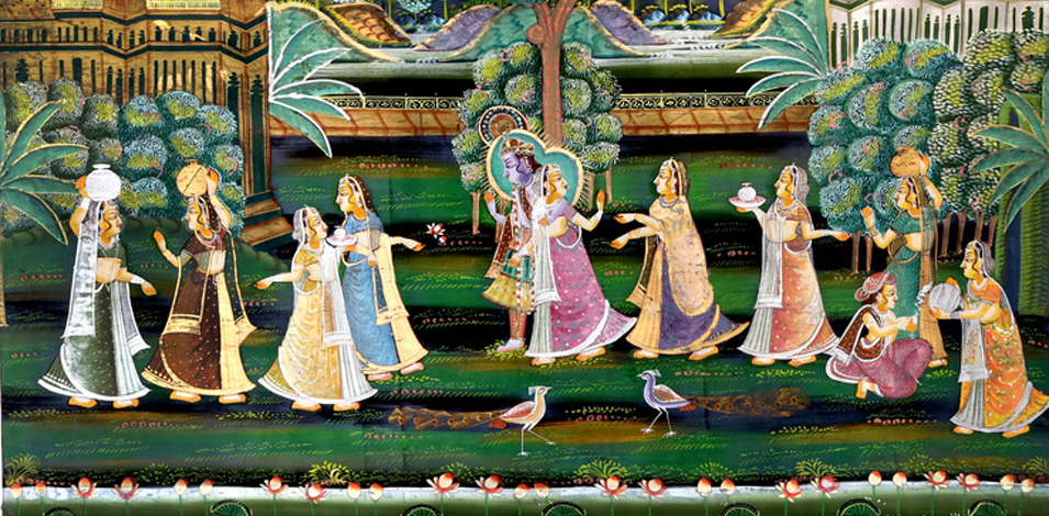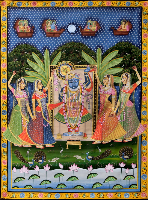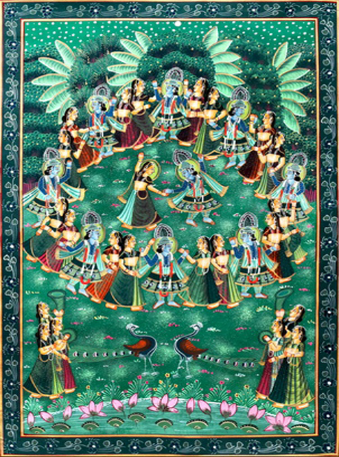 Shri Radhakrishna Pichhavais are finest narration of Shri RadhaKrishna Lilas performed in Gokul and Vrujbhumi. Pichhavai Paintings describe superbly the sacred lila-activities of Shri RadhaKrishna, which have great earthly and cosmic values. Pichhavais are mainly made to hang in Hindu temples of the Pushtimarg devotional tradition.